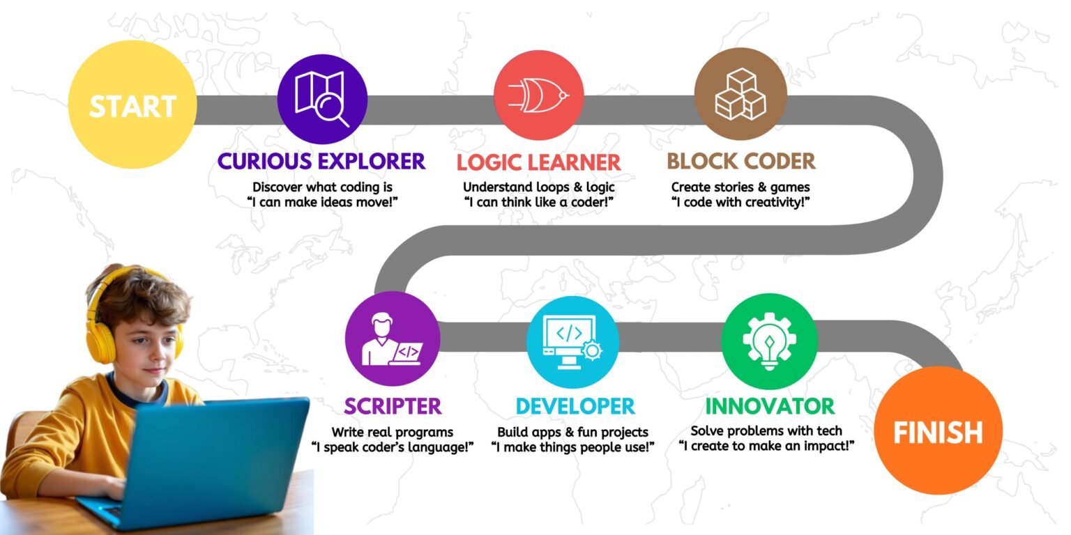 Our coding programs are designed for children aged 6 to 16 years, with age-specific levels — from block coding for beginners to Python and AI basics for advanced learners.
