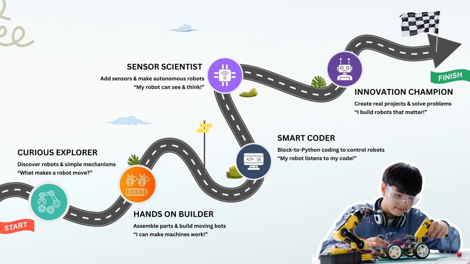 Our hands-on curriculum takes your child through every stage of robotics — learning, building, and coding to become future-ready innovators.